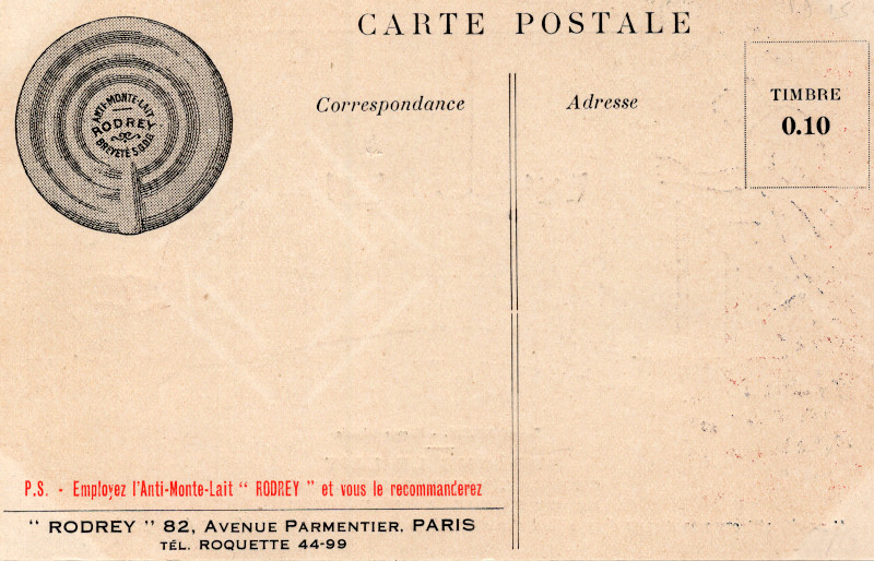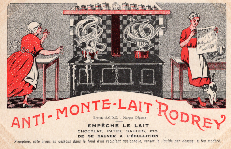 Reklamowa karta pocztowa francuskiego producenta metalowych krążków do gotowania mleka – „Rodrey”