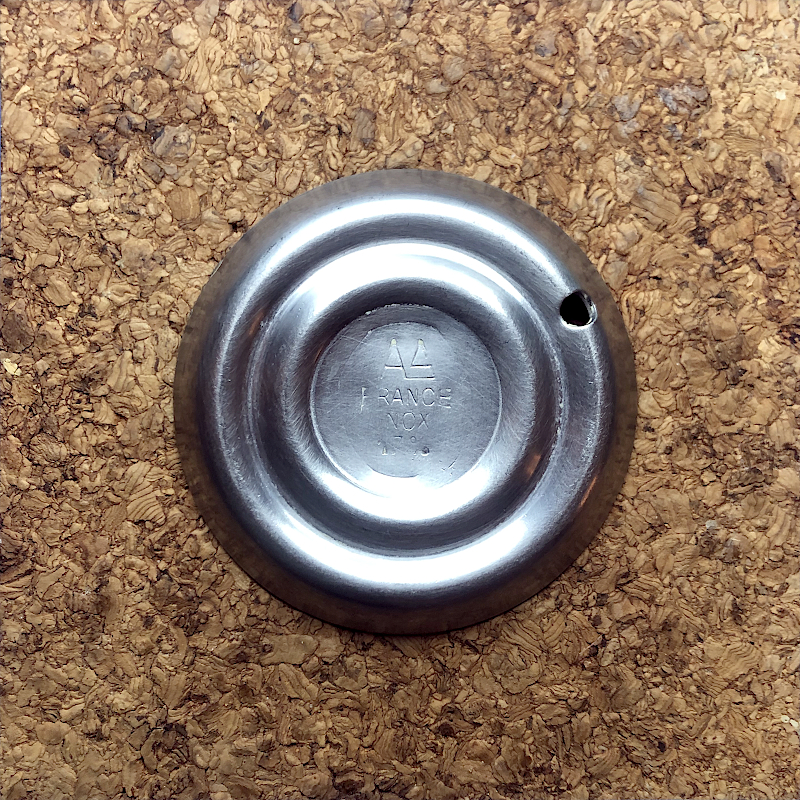 - znaki szczególne :: ; awers = dwa pierścieniowe wklęsłe przetłoczenie; rewers = dwa pierścieniowe wypukłe przetłoczenie z centrycznie wytłoczonym motywem składającym się ze stylizowanego znaku firmowego A4 i trójwierszowego napisu pod nim o treści FRANCE INOX 17%