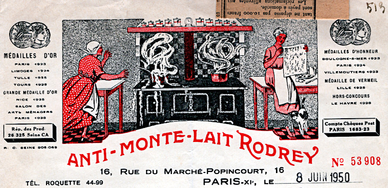 Rachunek z naklejonym dowodem wysyłki za sprzedarz m.in 30 szt. emaliowanych krążków do gotowania mleka. Rachunek datowany jest na dzień 8 lipca 1950 i wystawiony jest przez paryską firmę produkująca krążki o nazwie „ANTI-MONTE-LAIT RODREYY”. W owym czasie siedziba firmy znajdowała się w Paryżu przy Rue du Marché-Popincourt 16. Motyw graficzny nagłówka jest identyczny jak na pocztowej karcie reklamowej tejże firmy. Z tą różnicą, że wspomniana karta pocztowa na rewersie ma odnotowany inny adres siedziby firmy. Znajdowała się ona wtedy na Avenue Parmentier 82 w Paryżu.