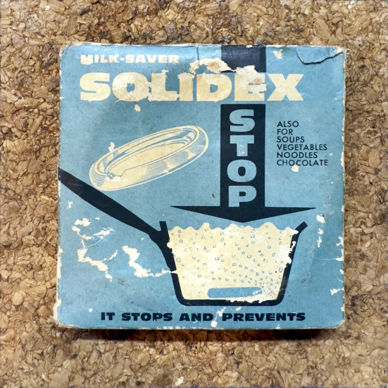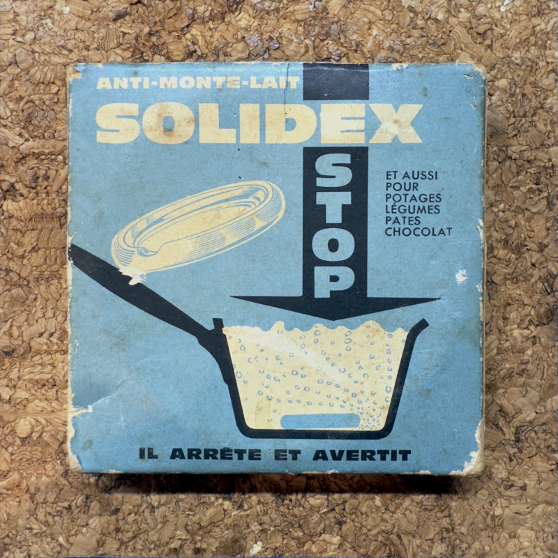 PS. Na opakowaniu pokazano sposób umieszczenia krążka w rondlu. Zamieszczono też francuskojęzyczną informację że krążek powstrzymuje kipienie zup, gotujących się roślin strączkowych, legumin i czekolady (a jego nazwa wskazuje, że jest przeciw kipieniu mleka). Na samym dole tłustym drukiem napisano „zatrzymuje i ostrzega”