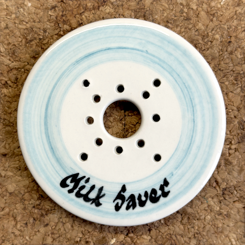 znaki szczególne :: awers = znak firmowy producenta umieszczony z boku wgłębienia; rewers = niebieski okrąg namalowany przy krawędzi krążka z namalowanym na nim odręcznie napisem Milk Saver