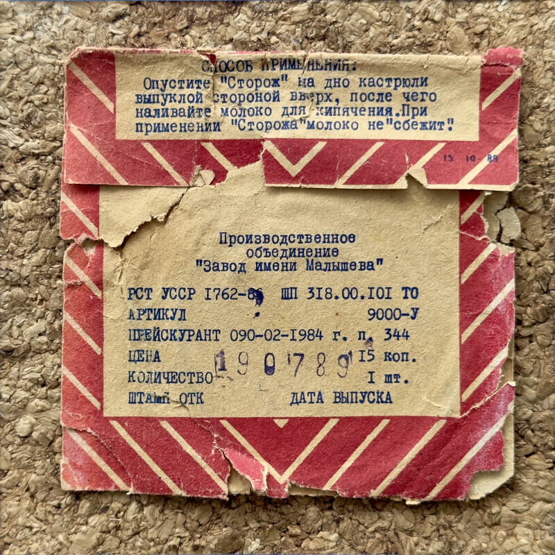 Natomiast informacje o produkcie informowały m.im.o tym, że: producentem krążka były Zakłady imieniem Małyszewa (produkującej podówczas głównie czołgi na potrzeby Armii Radzieckiej), krążek był wykonany wg normy RST USSR 1762-86 „Artykuły gospodarstwa domowego ze stali nierdzewnej. Ogólne warunki techniczne” [ros. РСТ УССР 1762-86: „Вироби господарські з нержавіючої сталі. Загальні технічні умови”], nr artykułu 9000-U, jego cenę określał cennik z lutego 1984 poz. 344, i wyprodukowano go 19 lipca 1989 r.