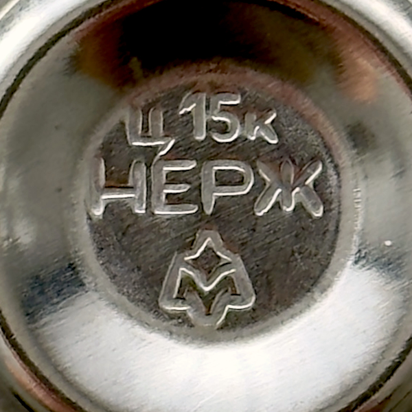 znaki szczególne :: awers = 3 wklęsłe, koncentryczne pierścienie połączone wklęsłym odcinkiem; rewers = trzy wypukłe, koncentryczne pierścienie połączone wypukłym odcinkiem, na środkowym okrągłym, wklęsłym polu wybity dwuwierszowy napis informujący o cenie (15 k0piejek) i pod nim skrót „nierż” [ros. нерж] oznaczający, że krążek wykonano ze stali nierdzewnej; pod nimi wybito logotyp producenta.