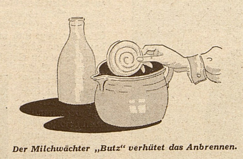Praktyczne porady dla kuchni i piwnicy […] Niestety mleko łatwo się przypala. […] Wtedy krzyk przerażenia wypełnia cały dom, a jeszcze silniej napełnia go nieprzyjemny zapach spalonego, a nawet wykipiałego mleka. […] Ale nie musimy się już tym martwić, jeśli kupimy mały strażnik mleka [Milchwächter] „Butz”, który zapobiega przypaleniu i wykipieniu. Jest wykonany z glazurowanej gliny i ma spiralę na dole i stożkowy otwór pośrodku. Spiralę umieszcza się w garnku skierowaną w dół i ustawia na kuchence gazowej, kominkowej lub spirytusowej. Podczas gotowania opary najpierw powstają pod połową spirali i są wypychane do góry przez otwór w krążku. Unoszące się wokół opary utrzymują mleko w ciągłym ruchu i zapobiegają jego spaleniu lub wykipieniu. Nie musisz zachować ostrożności ani używać trzepaczki, możesz po prostu pozostawić mleko własnemu losowi, aż się zagotuje. Krążek niszczy również tworzenie się kożucha, który w przeciwnym razie powstaje podczas gotowania i który jest nieprzyjemny dla wielu osób. Po użyciu strażnika mleka [Milchwächter] i garnek, których oczywiście nie wolno używać do przygotowywania innych potraw, należy dobrze oczyścić sodą i odłożyć.